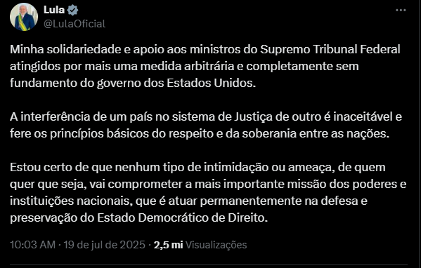 Lula também disse estar certo de que “nenhum tipo de intimidação ou ameaça, de quem quer que seja, vai comprometer a mais importante missão dos poderes e instituições nacionais, que é atuar permanentemente na defesa e preservação do Estado Democrático de Direito”. E também: “Minha solidariedade e apoio aos ministros do Supremo Tribunal Federal atingidos por mais uma medida arbitrária e completamente sem fundamento do governo dos Estados Unidos.”