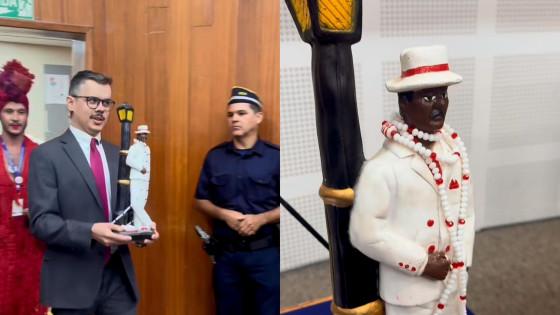 A entrada do vereador chamou a atenção por ser acompanhada de um “ponto”, canto característico desses cultos, enquanto ele carregava a figura de um homem negro vestido com terno branco e detalhes vermelhos até a mesa diretora.